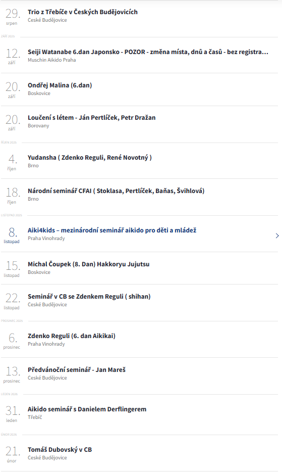 Rezervujte si čas na Zdenka Reguli 22.11.2025 a Honzu Mareše 13.12.2025, případně další Publikováno 13. 8. 2025 | Autor: Floop A vice na: www.czech-aikido.cz/seminare